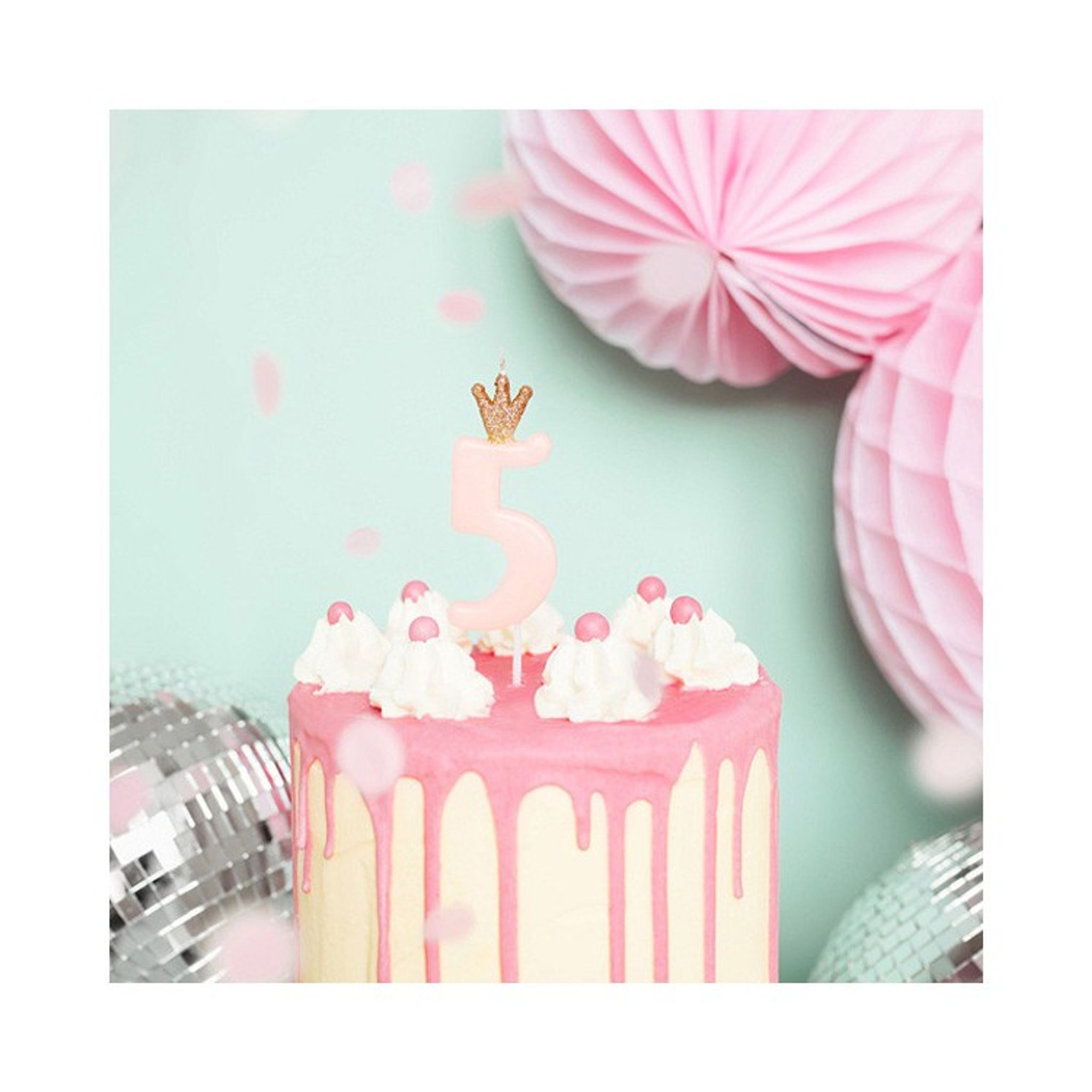 Fyller flickan eller pojken 5 år? Det här tårtljuset blir en extra fin detalj på födelsedagstårtan på barnkalaset. Tårtljuset är ljusrosa med en guldig glitterkrona på toppen. Dekorativ och fin att fira 5-åringen med!