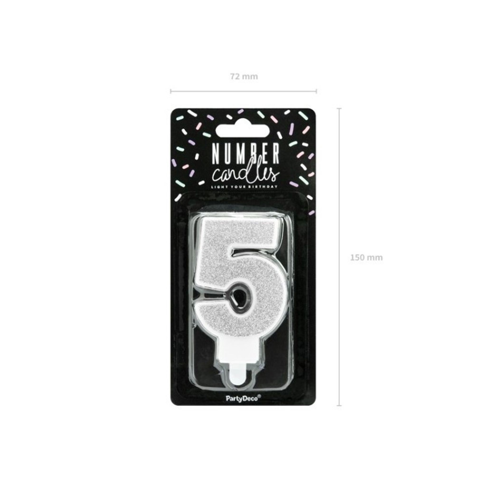 Tänd tårtljus för födelsebarnet och låt denna blåsa ut ljuset och avge sig den årliga önskan. Tårtljuset är silverglittrig i form av en 5:a med måttet 8x4 cm. Kombinera siffran med en nolla för den blivande 50-åringen!