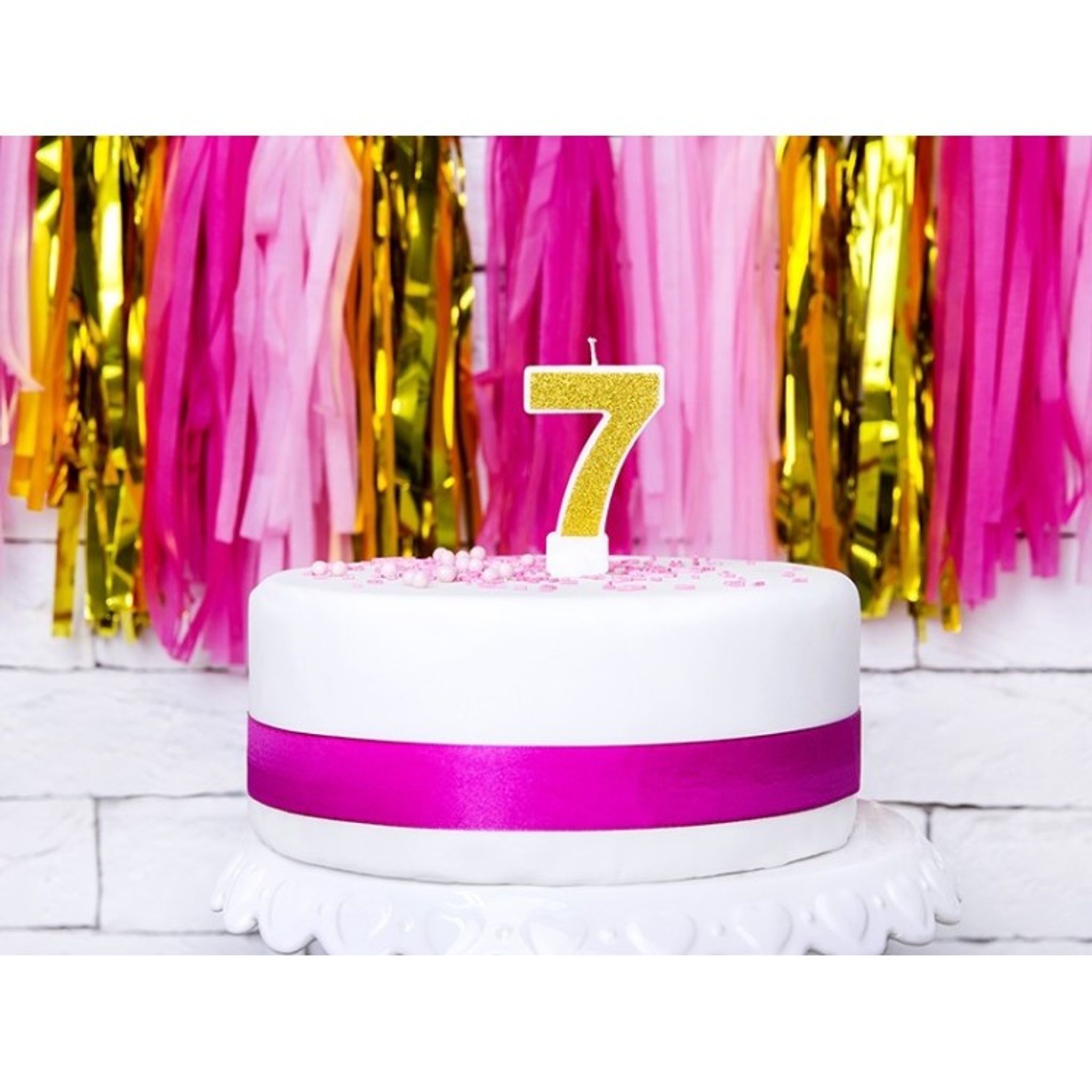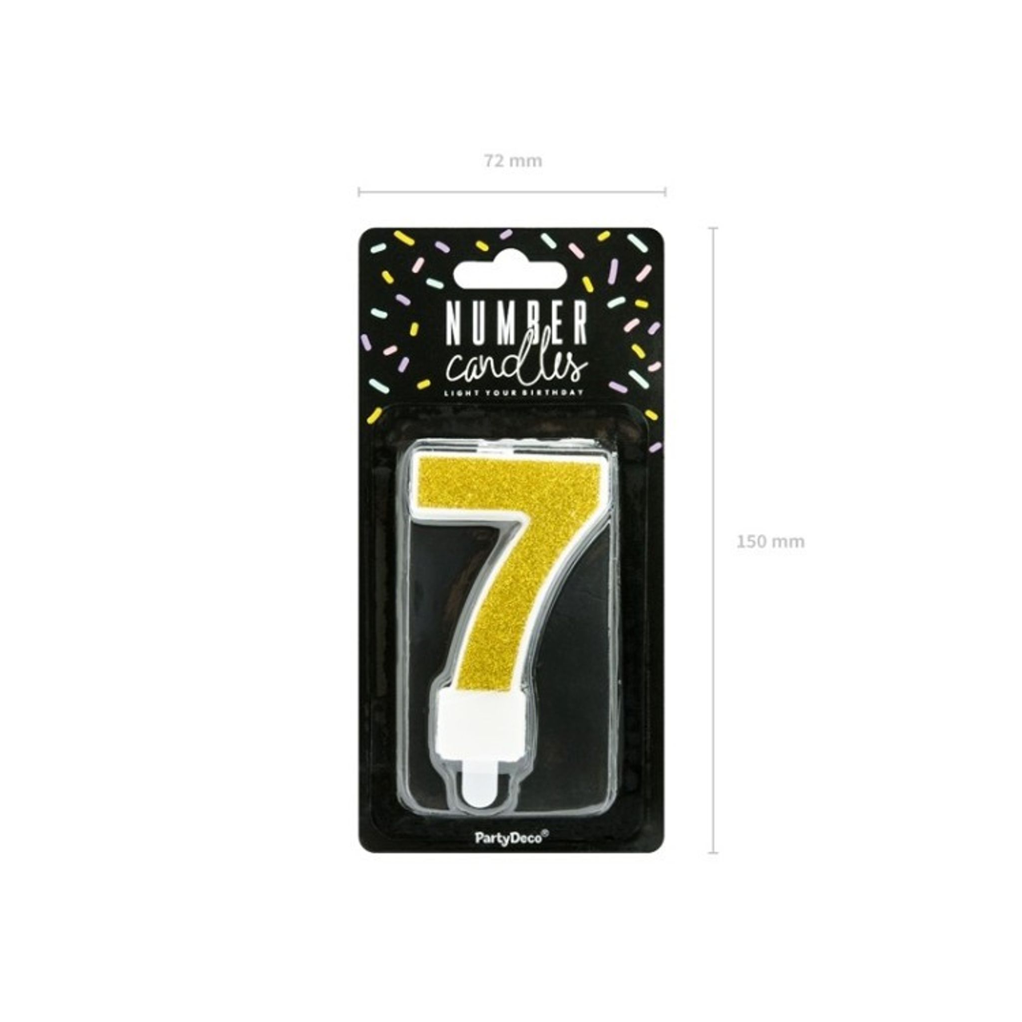 Ska du fira något som fyller 7 år eller kanske 70 år. Med hjälp av detta läckra glittriga tårtljus dekorerar du lätt tårtan. Tårtljuset är i formen av en guldglittrig 7:a. Kombinera med en guldig nolla om det är 70-års kalas på gång.