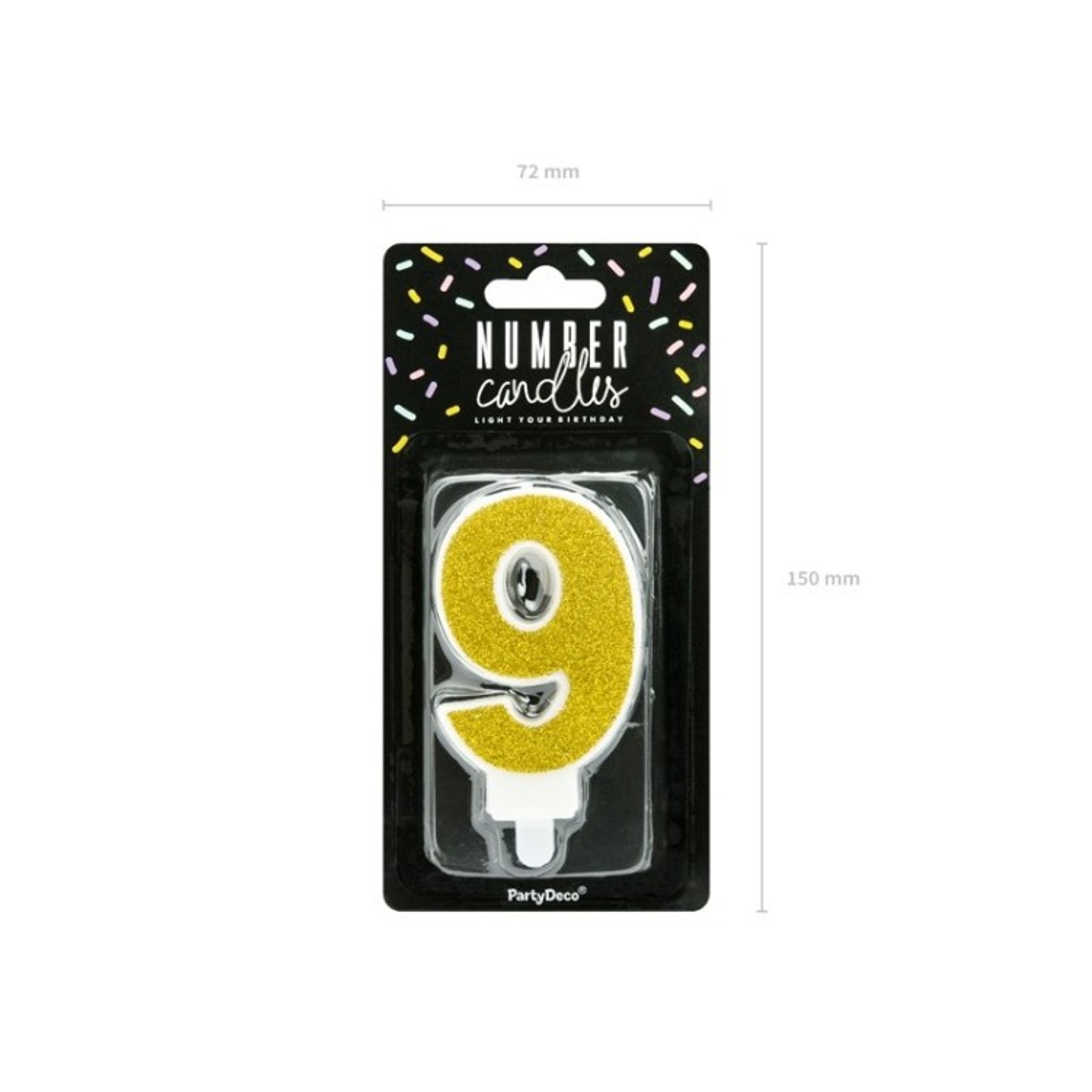 Ska du fira något som fyller 9 år eller kanske 90 år. Med hjälp av detta läckra glittriga tårtljus dekorerar du lätt tårtan. Tårtljuset är i formen av en guldglittrig 9:a. Kombinera med en guldig nolla om det är 90-års kalas på gång.