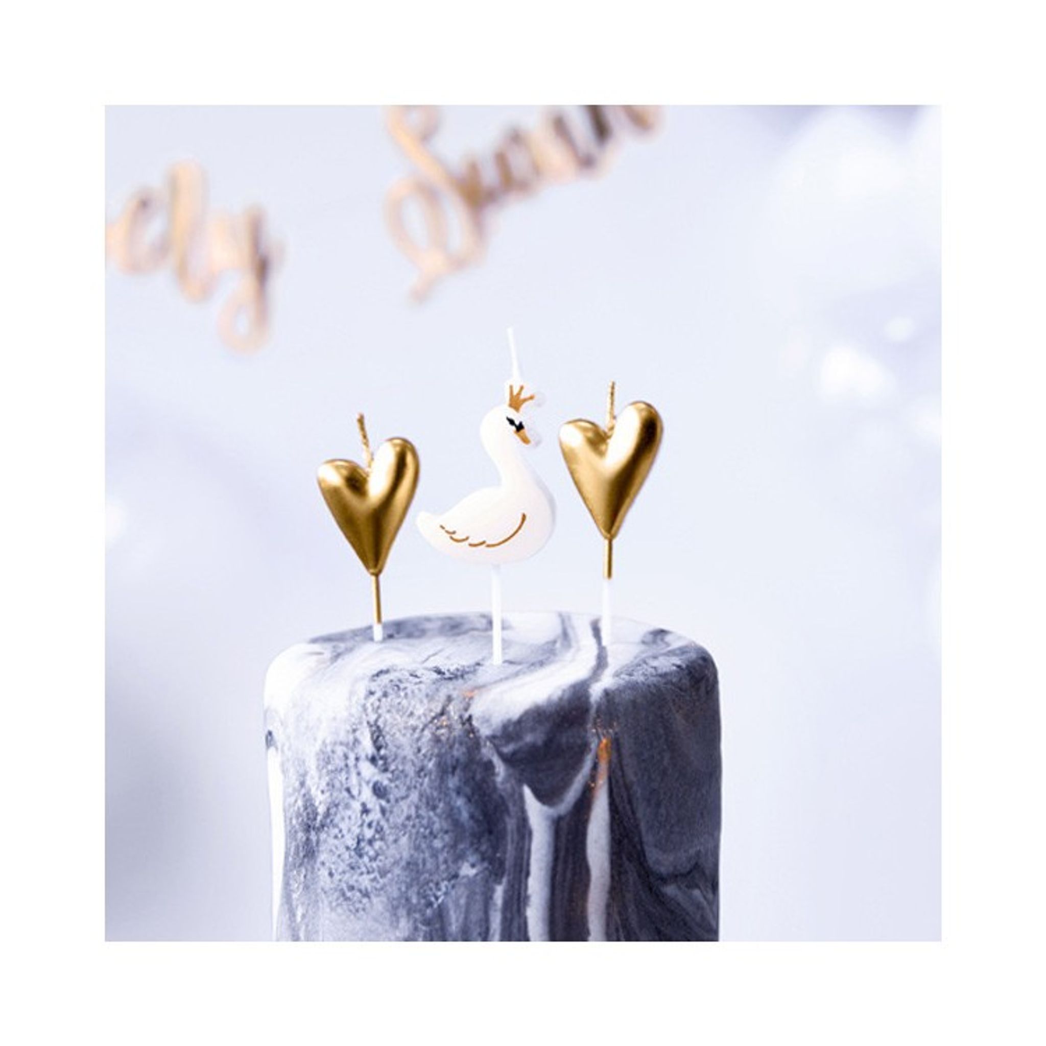 Supersnygga tårtljus i form av vita svanar och guldiga hjärtan. Perfekt att dekorera tårtan med!