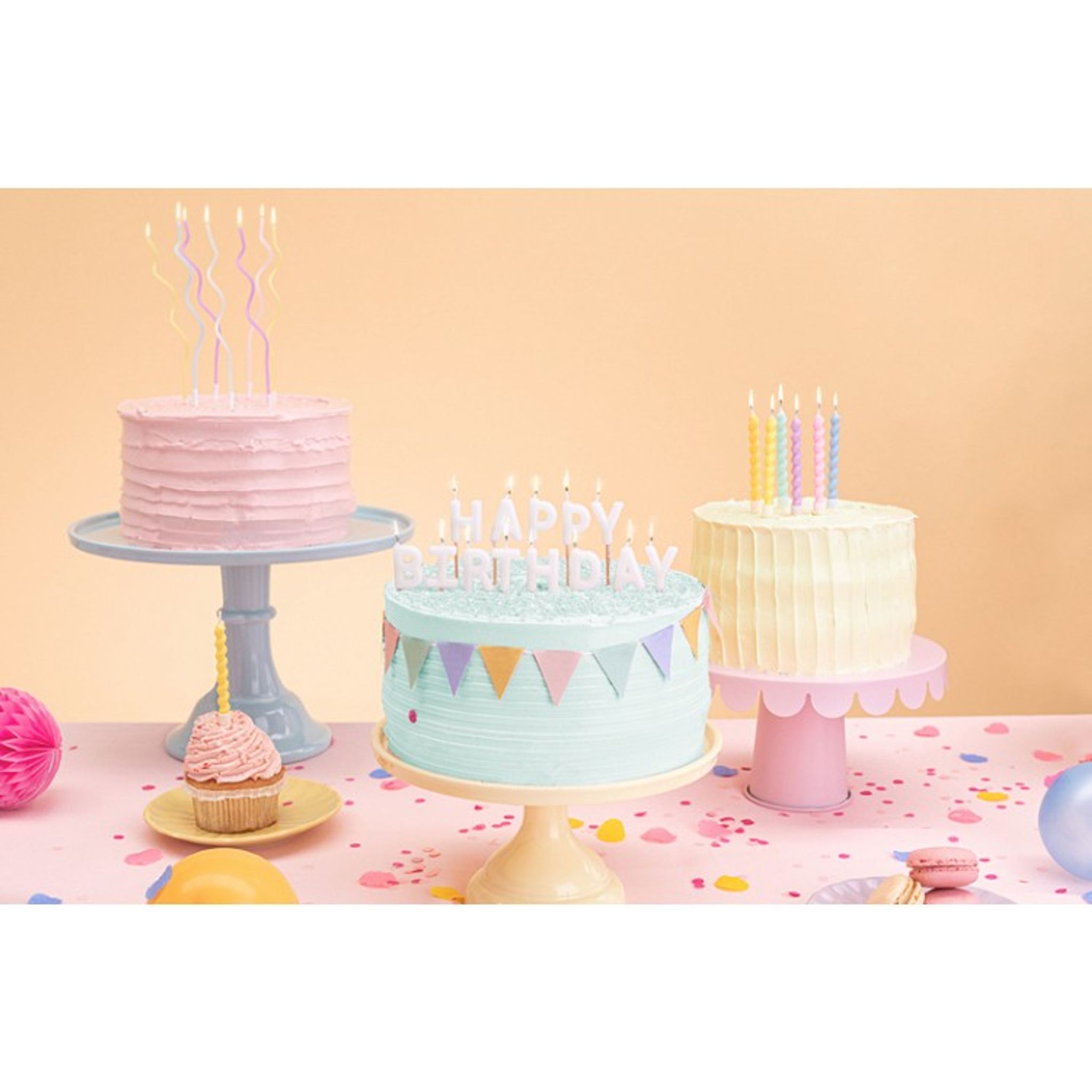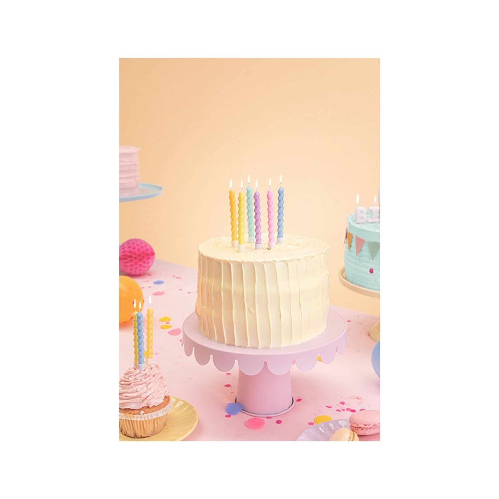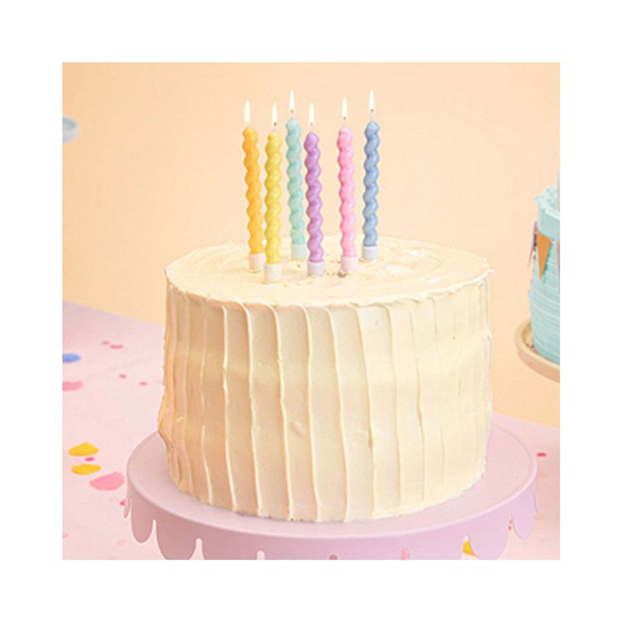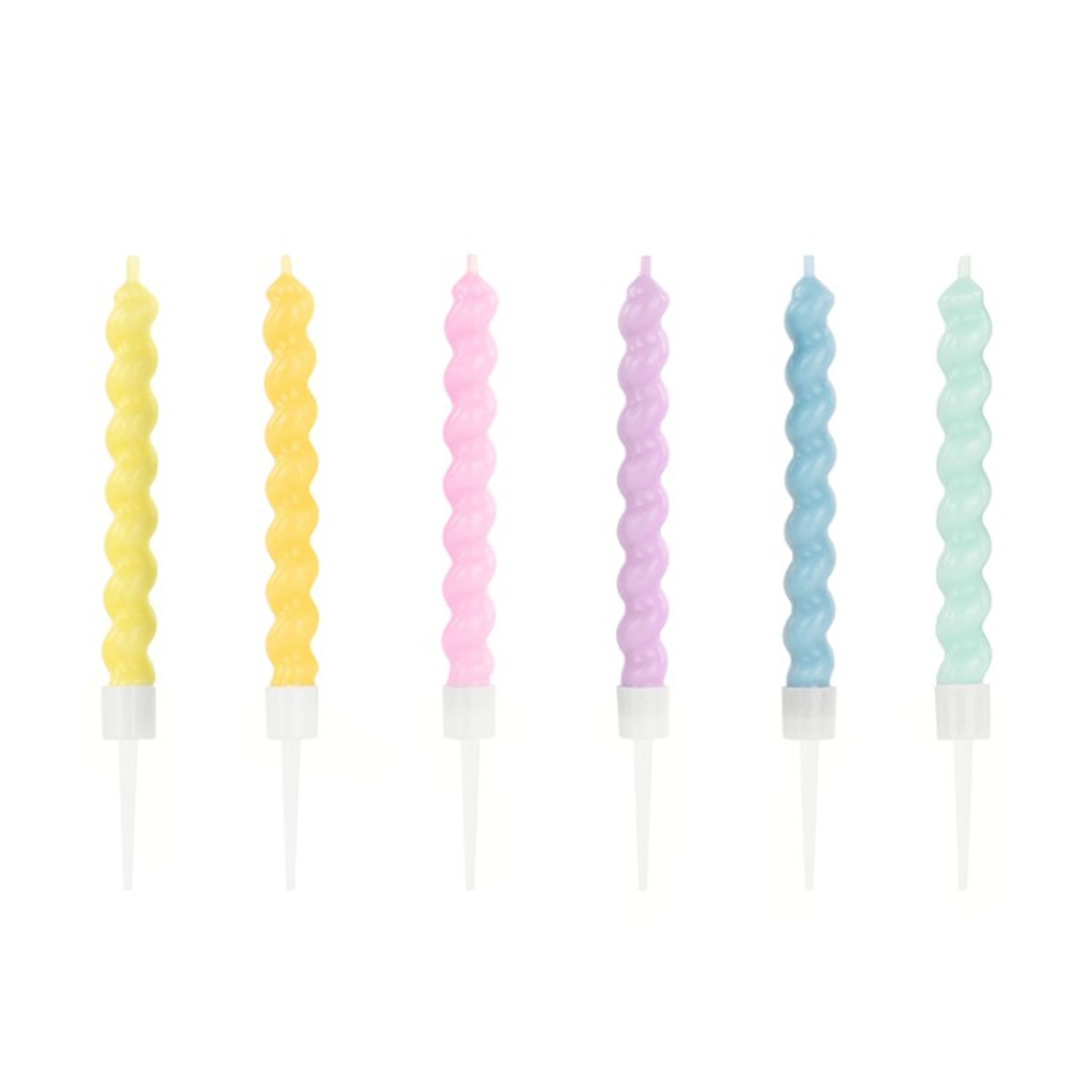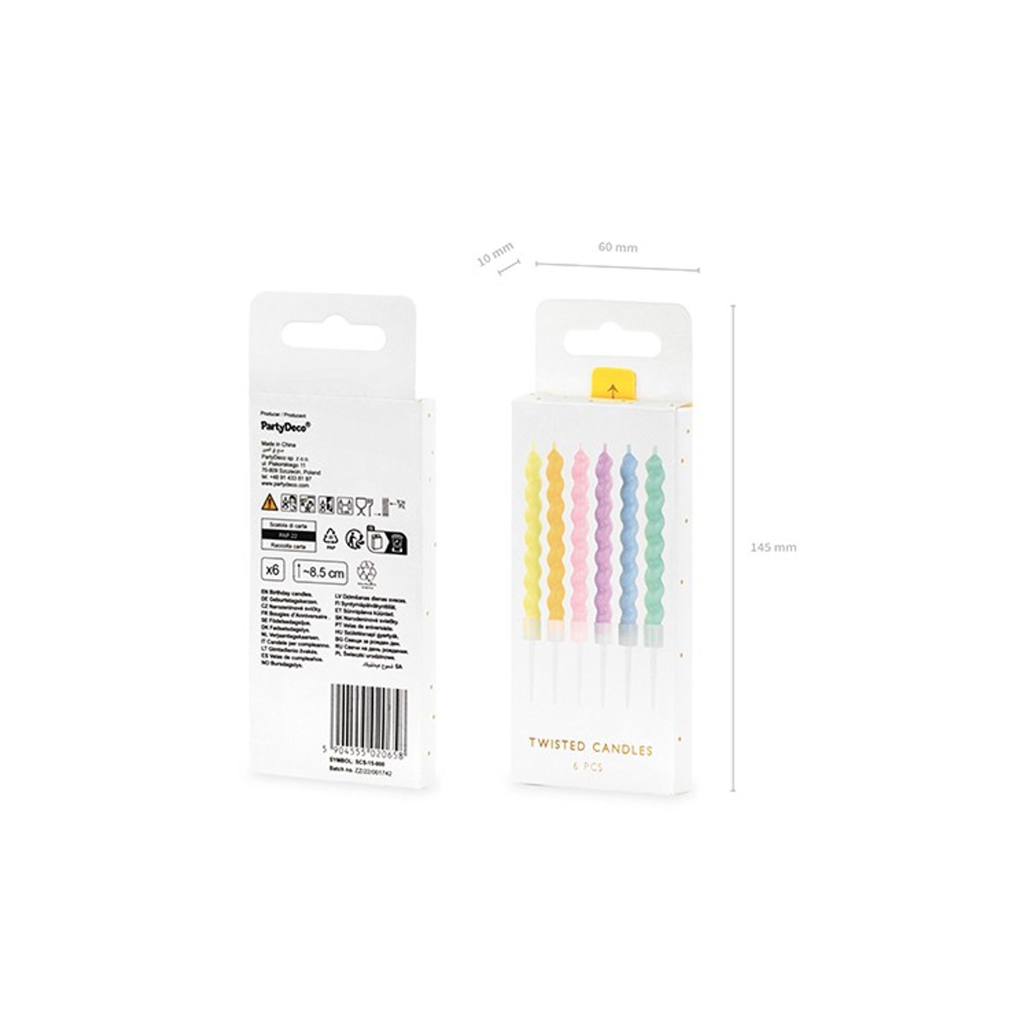 Tvistade tårtljus i fina pastellfärger. Dekorera tårtan eller andra bakverk med dessa härliga tårtljus. En förpackning innehåller 6 fina ljus som är 8,5 cm höga.
