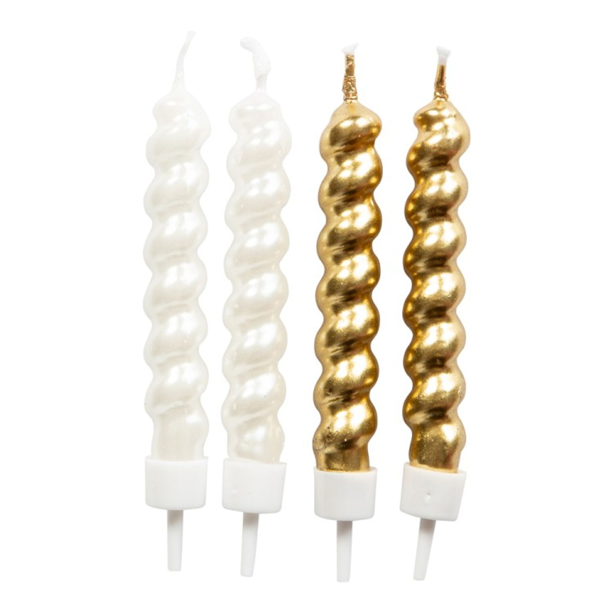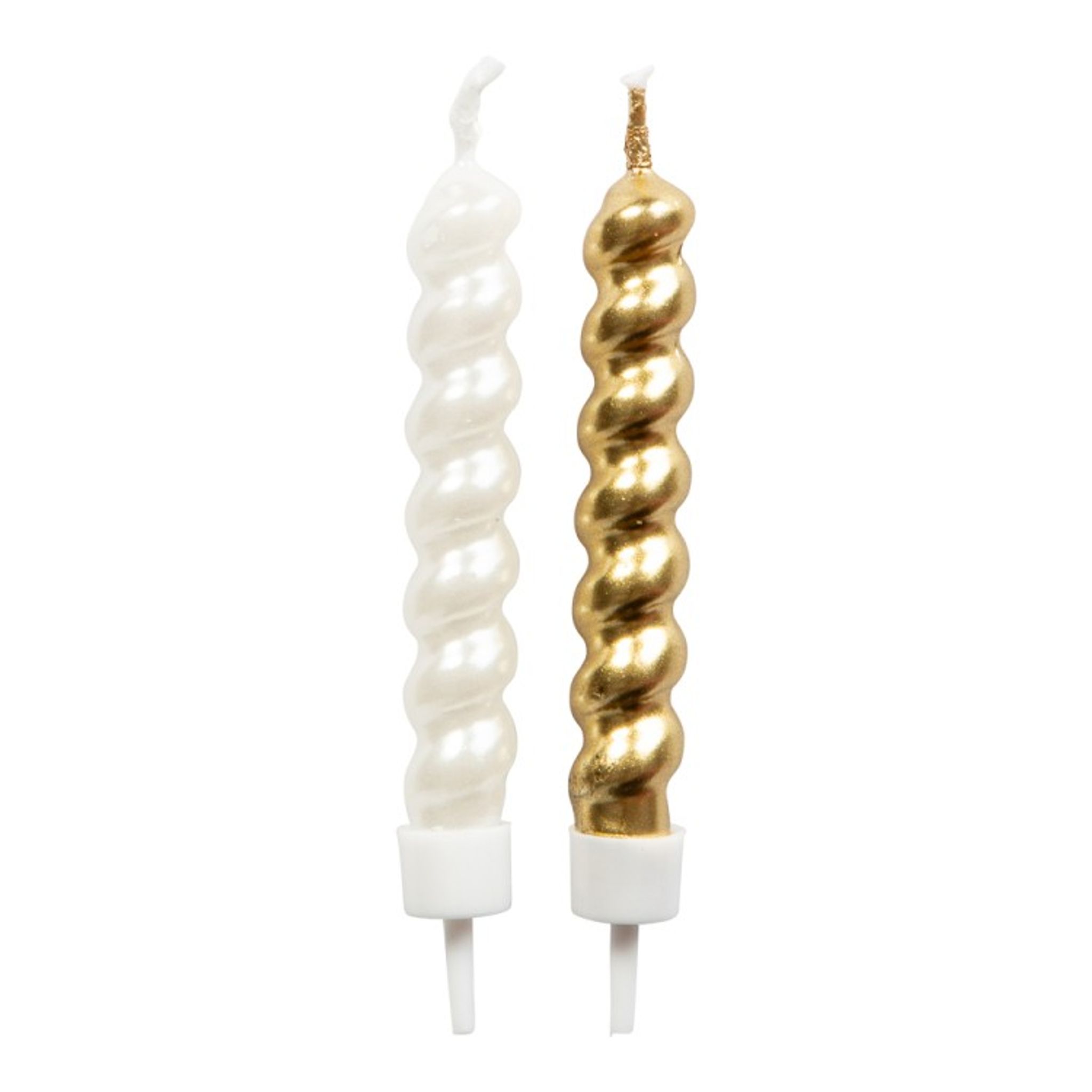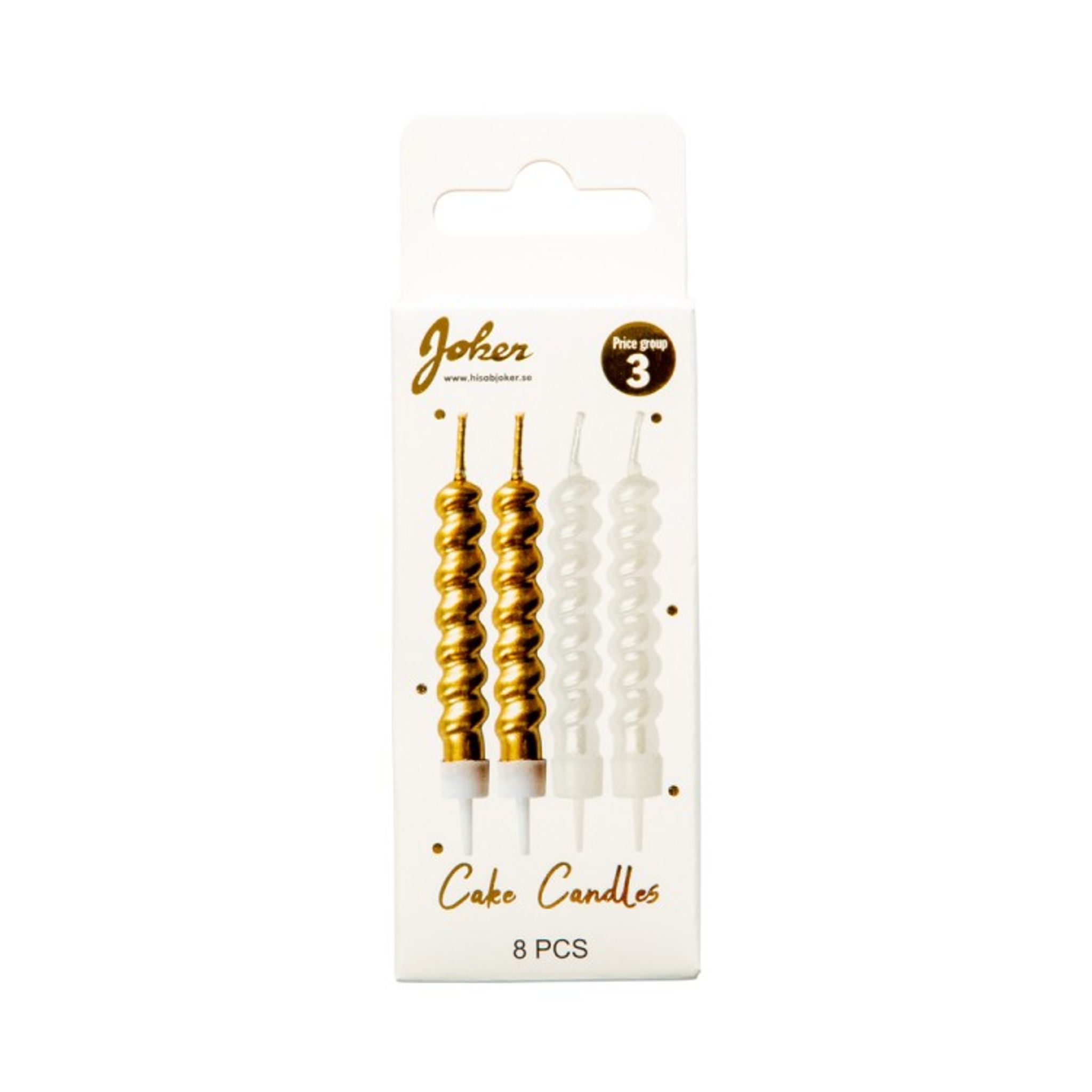 Tvistade tårtljus i fin mix av vit och guld. Passar utmärkt till födelsedagstårtan, studenten, dopet eller nyår. Höjd: 6 cm Innehåller 4 st vita ljus och 4 st guldiga ljus.
