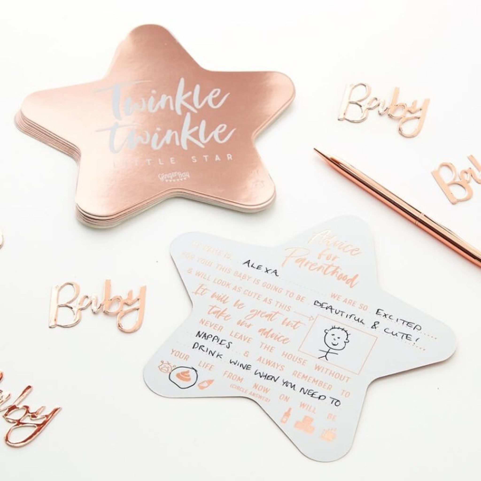 Sprid dina visdomsord för de blivande föräldrarna med dessa söta rosé guldfolieformade stjärnkort. Dessa eleganta rosa guldfolierådgivningskort ger babyn och föräldrarna några vackra minnen från babyns första tid.