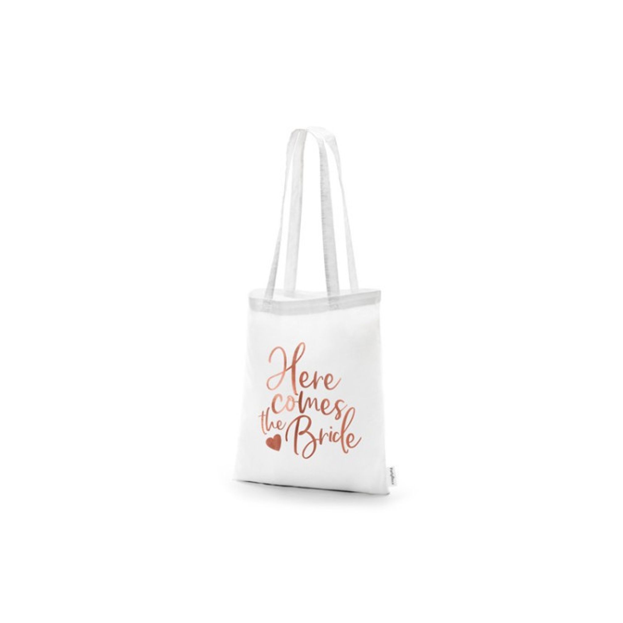 Tygpåse med texten "Here comes the Bride". Perfekt att ha med på möhippan och även ett kul minne! Tygpåsen är i vitt med snygg text i roséguld. Storlek: 39 x 42 cm 100% bomull
