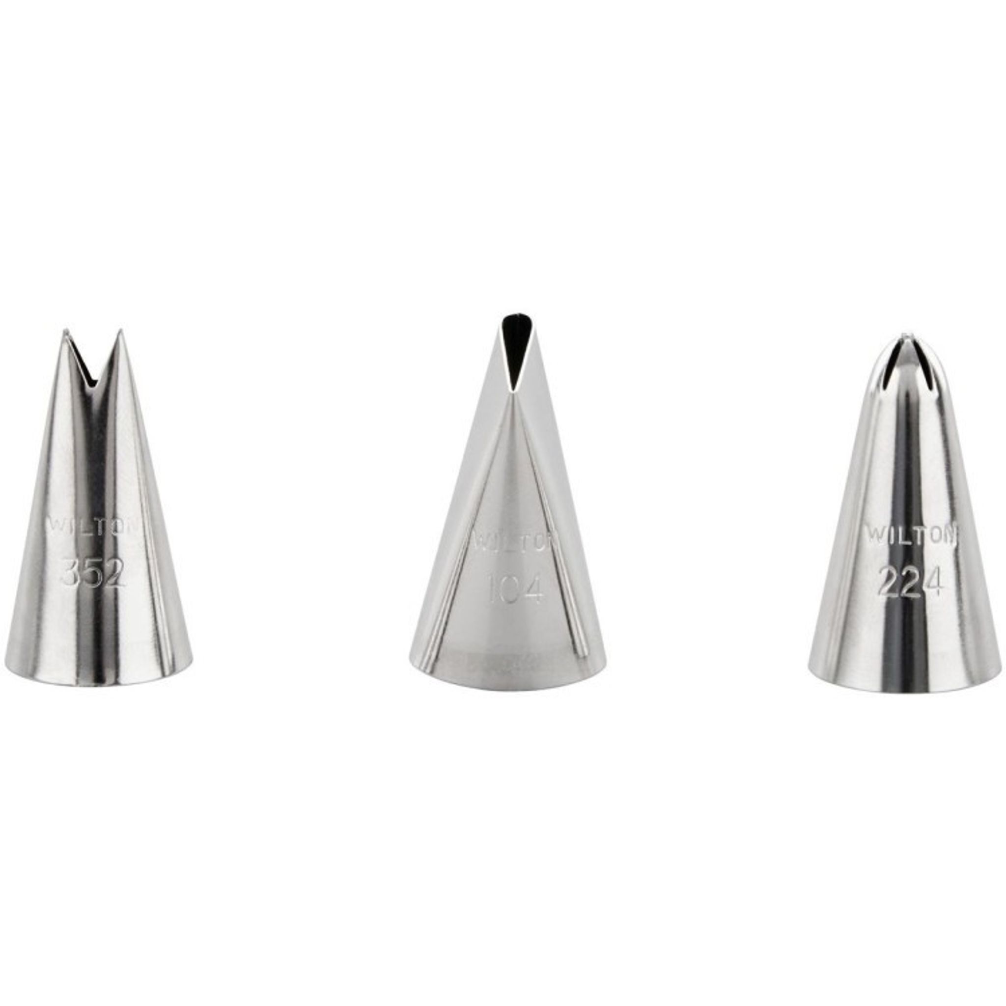 Set med tre Wiltontyllar.#104: dekorationsspets i metall för att skapa blomblad, bågar, girlander etc.#352: dekorationsspets i metall för att skapa levande blad, men även små snäckor.224: dekorationsspets i metall för att skapa små droppblommor med fem kronblad.