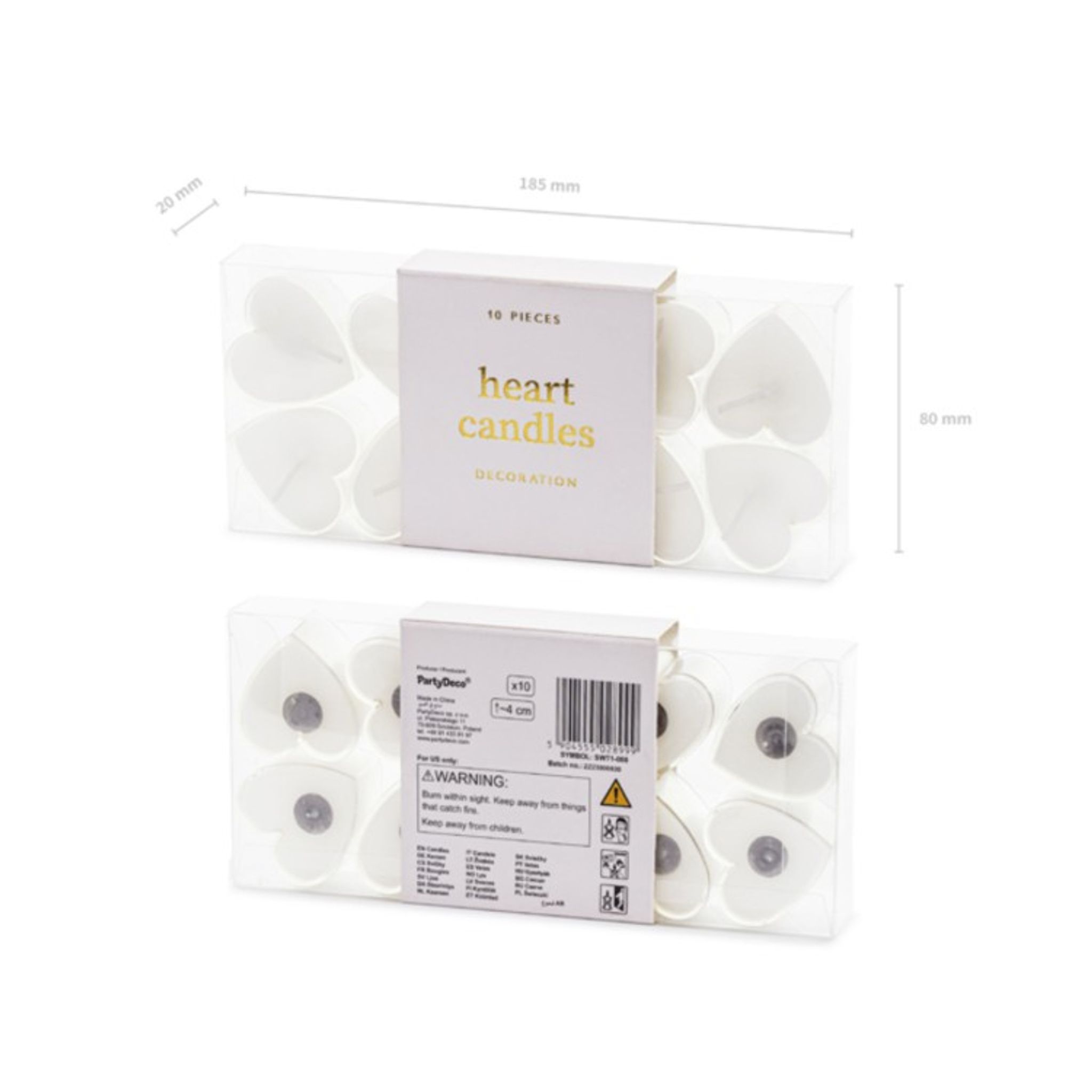 Värmeljus i form av vita hjärtan. Vackra att dekorera din dukning med på bröllopet eller andra bjudningar med kärlekstema. Värmeljusen är i små hjärtformade plastformar ca 4 cm stora, 10-pack.
