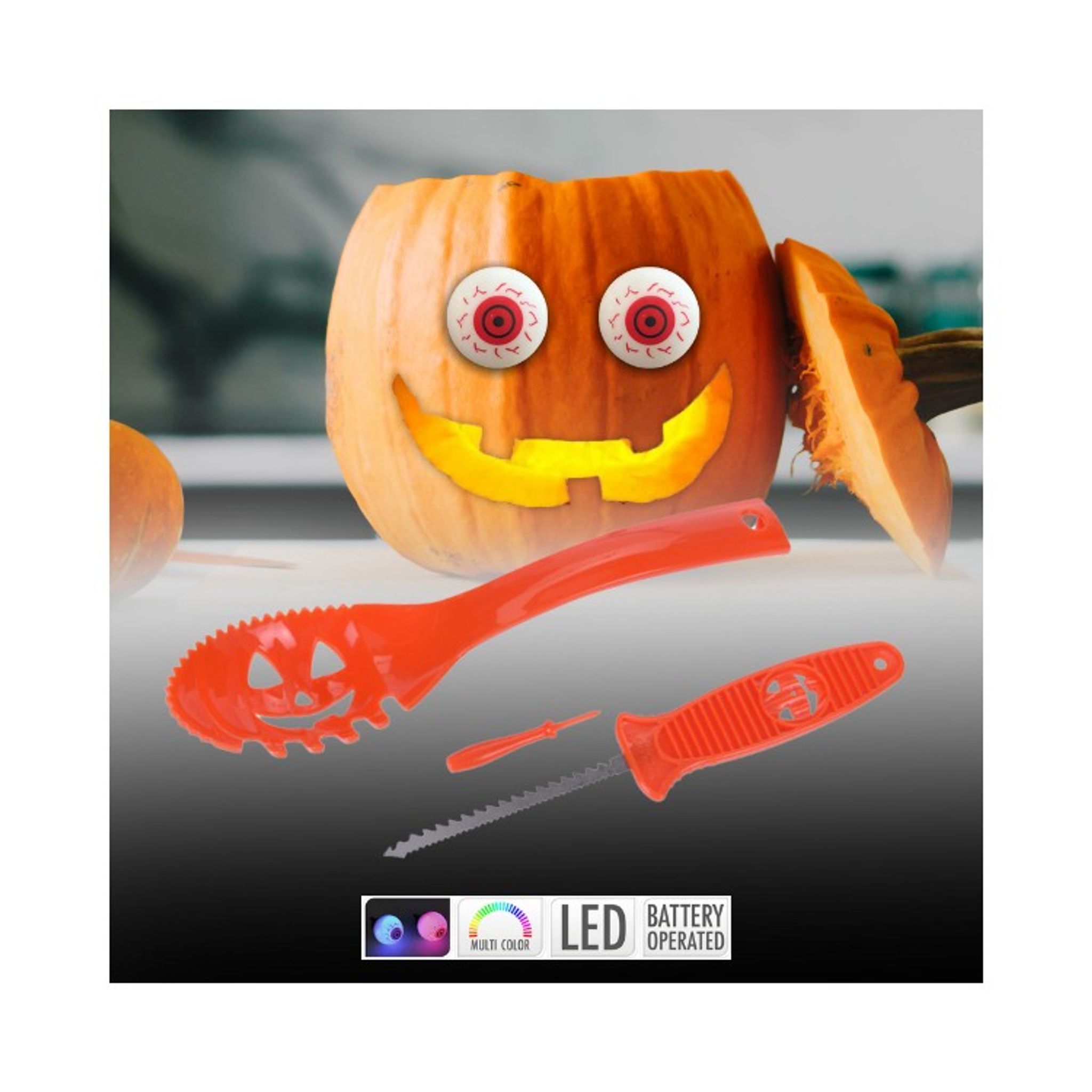 Dags för årets Halloween pumpa? Det här set:et gör det både enklare och roligare! Med hjälp av setet för karvning kan du enkelt såga former och gröpa ur innehåll. Avsluta med att sätta läskigt coola ögon på pumpan. Dessa ögon lyser i läckra färger och blir en rolig detalj på Halloweenpumpan utanför dörren.