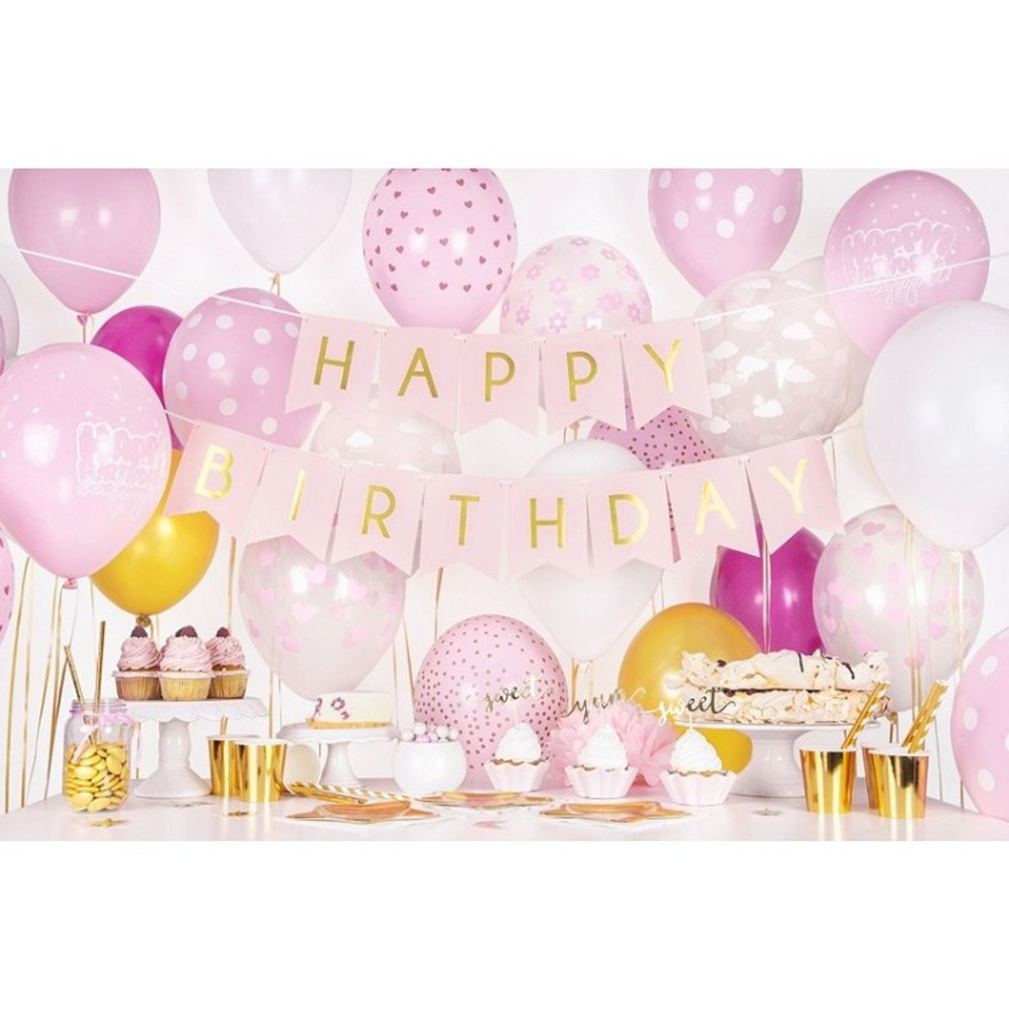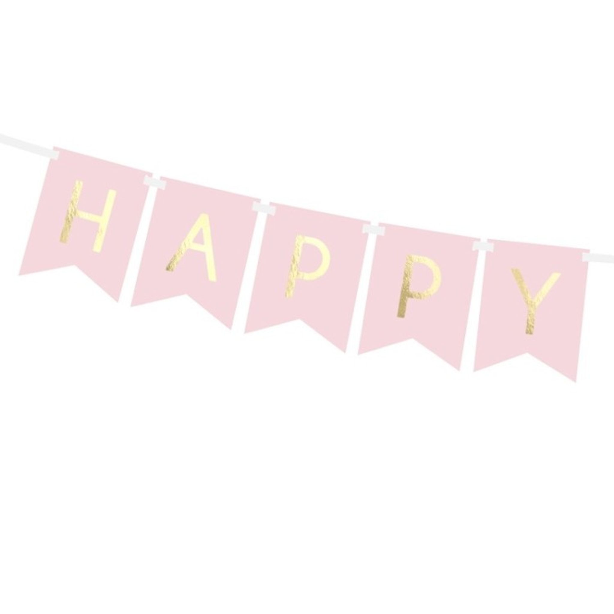 Superfin flaggirlang i mild fin rosa färg med texten Happy Birthday i guld. Faggirlangen passar lika fint till barnets födelsedag som till den vuxnas fest.