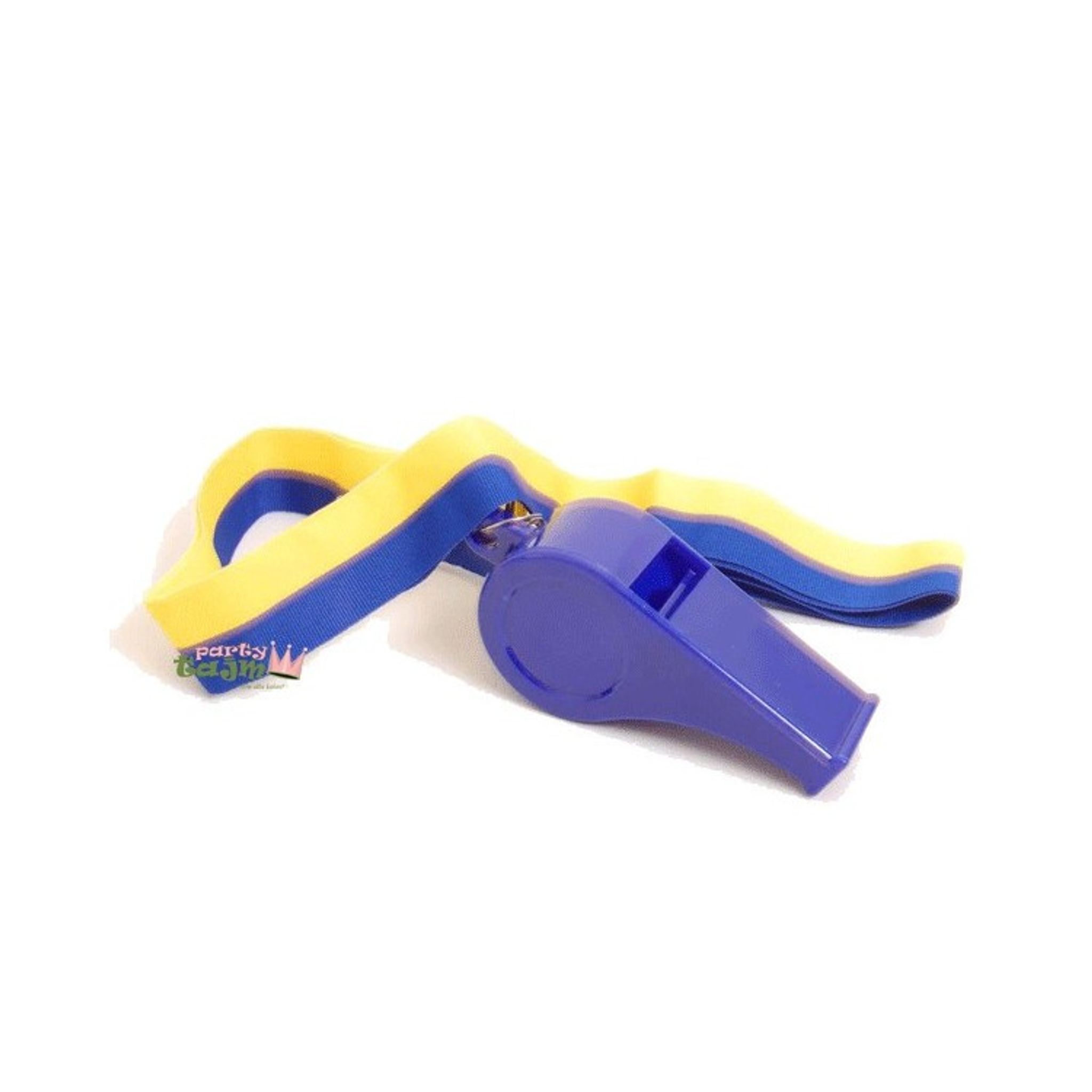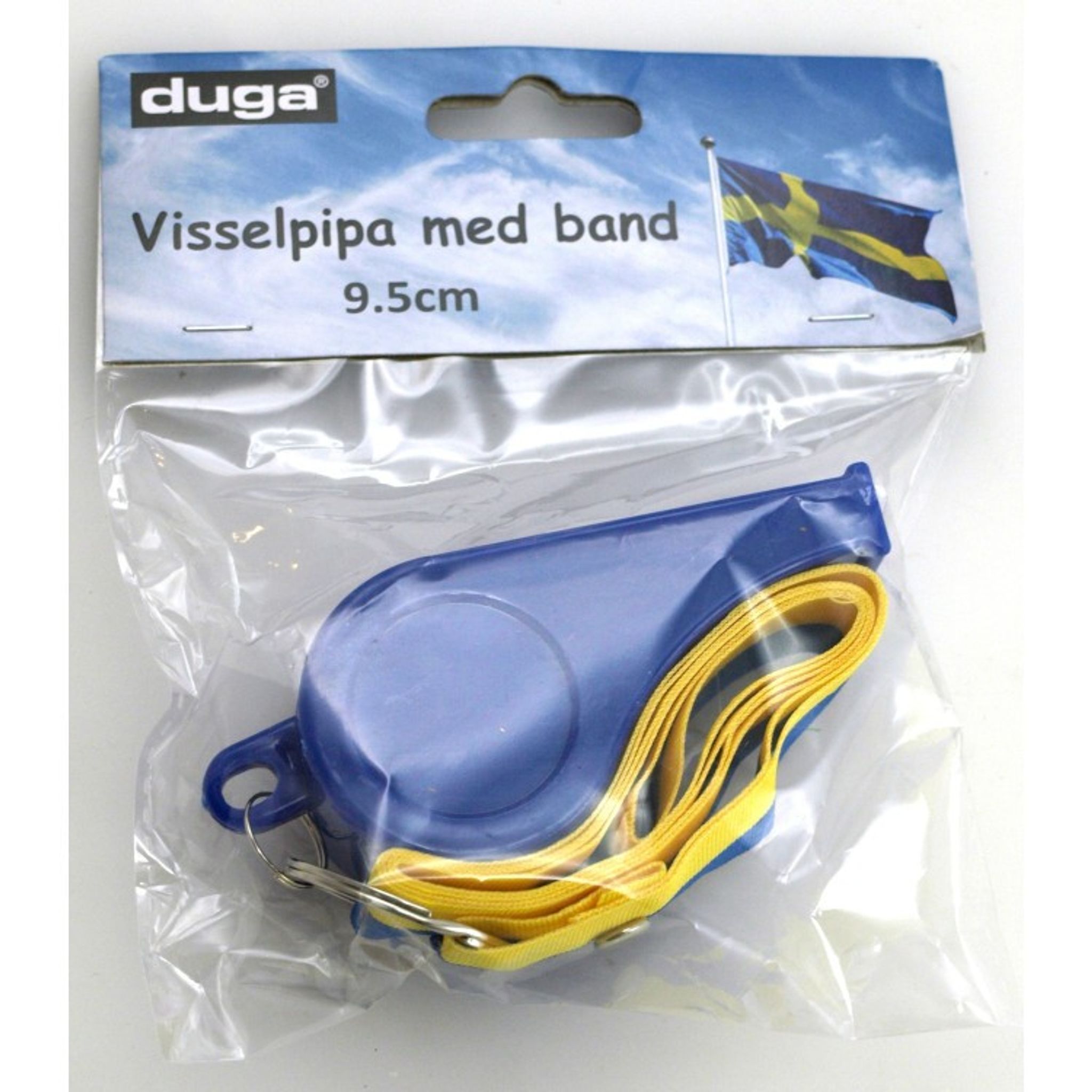 Visselpipa i metall som hänger i ett gul/blått band. Perfekt att hänga runt halsen på den nyblivna studenten eller varför inte ge till deltagarna på fotbollstuneringen? Priset avser 1st.